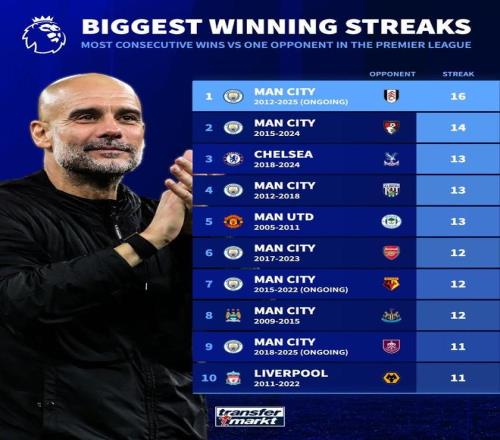 1 曼城 2012-2025(进行中) vs富勒姆 16连胜
