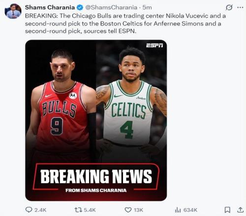 北京时间2月4日凌晨,ESPN名记Shams继续爆料,芝加哥公牛与波士顿凯尔特人达成交易,尼古拉-武切维奇+1个次轮签与安芬尼-西蒙斯+1个次轮签进行了互换。