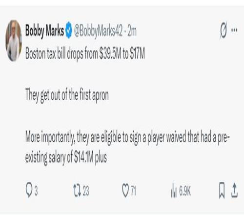 绿凯也成功从第一奢侈税征点上下来了,更关键的是,他们有资格裁掉一位球员,该球员此前的薪水为1410万美元。